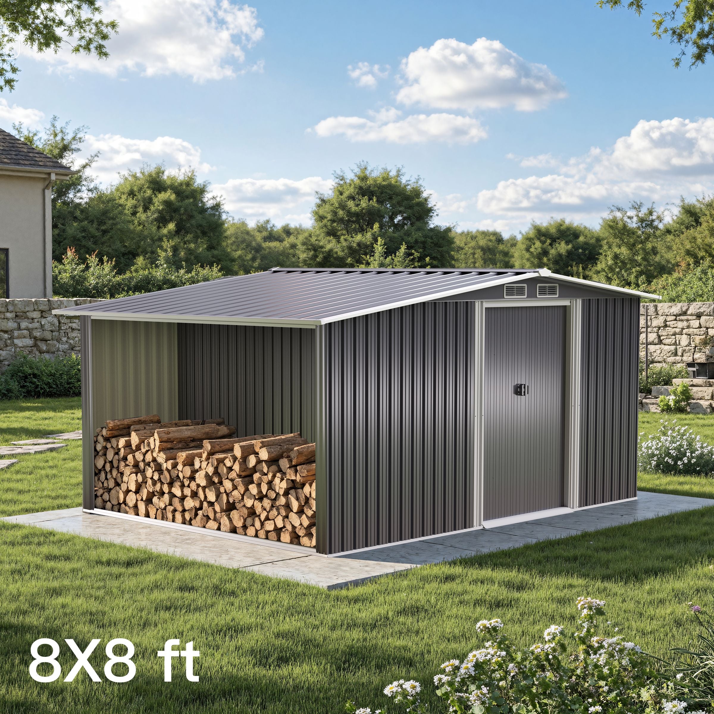 Description. Upgrade your backyard organization with this garden metal storage shed, designed for durability and versatility. Built from galvanized steel with a gable rooftop, this shed ensures rainwater runoff while protecting your garden tools, firewood, and equipment from harsh weather.. The integrated firewood log rack provides additional storage space, making it a practical choice for both garden storage and firewood organization. UV-resistant, waterproof, and ventilated, this shed guarantees long-term performance, offering a reliable outdoor storage solution for all seasons.. Features. Extra Large Storage Space – This 8ft metal storage shed features a dedicated wood log rack and spacious interior for storing tools, furniture, and garden equipment.. Gable Roof for Water Drainage – The angled rooftop prevents water accumulation, keeping stored items dry and protected.. Weather-Resistant & UV-Protected – Galvanized steel panels provide long-lasting resistance against rust, moisture, and UV rays.. Optimized Air Circulation – Built-in ventilation ensures proper airflow, reducing condensation and preventing mold buildup.. Heavy-Duty Build – Reinforced steel panels (0.27mm thickness) withstand wind, rain, and snow, ensuring year-round reliability.. Self-Assembly Design – Comes with detailed instructions for a hassle-free installation.. Dimensions & Details. Brand. Living and Home. Material. 0.25mm colour steel plate+0.6mm galvanized plate. Type. Heavy Duty Garden Shed. Colour options. Charcoal Black. Shed size available. 4’x 8′ ft: W 263 x H 178 x D 132cm. 6′ x 8′ ft: W 263 x H 178 x D 207cm. 8′ x 8′ ft: W 264 x H 178 x D 260cm. 10′ x 8′ ft: W 264 x H 178 x D 314cm. PS.This size does not include the 66cm wide matchroom. Door size. /. Level of Assembly. Assembly required. Package Included. Steel Shed x 1. Instruction Manual x 1. Digital Instruction Manual. 4′ x 8′ ft Instruction Manual. 6′ x 8′ ft Instruction Manual. 8′ x 8′ ft Instruction Manual. 10′ x 8′ ft Instruction Manual. FAQ. Q1: Is this metal storage shed waterproof and rust-resistant?. A1: Yes, this galvanized steel garden storage shed is weatherproof, rust-resistant, and UV-protected, ensuring durability against rain, snow, and sun exposure.. Q2: Does this shed include a floor base?. A2: No, this 8ft outdoor storage shed does not include a floor. We recommend placing it on a concrete slab, wooden base, or level ground for better stability.. Q3: How much firewood can the log rack hold?. A3: The built-in firewood storage rack is designed to hold a substantial amount of logs, providing a dedicated space for wood drying and easy access during winter.. Q4: Does this metal shed require maintenance?. A4: This low-maintenance garden shed only requires occasional cleaning with water and mild detergent. The galvanized steel panels prevent rust and corrosion, minimizing upkeep.. Q5: How difficult is it to assemble this storage shed?. A5: The self-assembly design comes with detailed step-by-step instructions. Two or more people are recommended for installation, and basic tools like a screwdriver and drill will be needed.. Q6: Can this shed be used for motorcycle storage?. A6: Yes, this heavy-duty metal shed provides ample space for motorcycle storage, protecting it from rain, sun, and dust. Ensure the ground is level for added stability.. Q7: Does this shed have ventilation to prevent condensation?. A7: Yes, this 8ft metal shed includes built-in air vents above the doors, ensuring proper airflow and moisture reduction, preventing mold and mildew buildup.. Q8: Is this outdoor shed suitable for extreme weather conditions?. A8: Yes, the reinforced galvanized steel panels and sloped gable roof make it resistant to wind, rain, and snow, providing year-round durability.