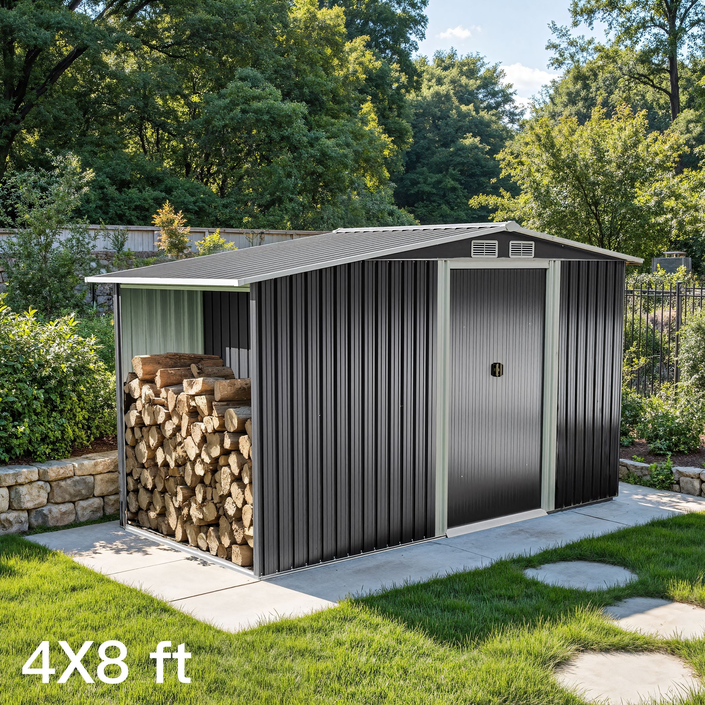 Description. Upgrade your backyard organization with this garden metal storage shed, designed for durability and versatility. Built from galvanized steel with a gable rooftop, this shed ensures rainwater runoff while protecting your garden tools, firewood, and equipment from harsh weather.. The integrated firewood log rack provides additional storage space, making it a practical choice for both garden storage and firewood organization. UV-resistant, waterproof, and ventilated, this shed guarantees long-term performance, offering a reliable outdoor storage solution for all seasons.. Features. Extra Large Storage Space – This 8ft metal storage shed features a dedicated wood log rack and spacious interior for storing tools, furniture, and garden equipment.. Gable Roof for Water Drainage – The angled rooftop prevents water accumulation, keeping stored items dry and protected.. Weather-Resistant & UV-Protected – Galvanized steel panels provide long-lasting resistance against rust, moisture, and UV rays.. Optimized Air Circulation – Built-in ventilation ensures proper airflow, reducing condensation and preventing mold buildup.. Heavy-Duty Build – Reinforced steel panels (0.27mm thickness) withstand wind, rain, and snow, ensuring year-round reliability.. Self-Assembly Design – Comes with detailed instructions for a hassle-free installation.. Dimensions & Details. Brand. Living and Home. Material. 0.25mm colour steel plate+0.6mm galvanized plate. Type. Heavy Duty Garden Shed. Colour options. Charcoal Black. Shed size available. 4’x 8′ ft: W 263 x H 178 x D 132cm. 6′ x 8′ ft: W 263 x H 178 x D 207cm. 8′ x 8′ ft: W 264 x H 178 x D 260cm. 10′ x 8′ ft: W 264 x H 178 x D 314cm. PS.This size does not include the 66cm wide matchroom. Door size. /. Level of Assembly. Assembly required. Package Included. Steel Shed x 1. Instruction Manual x 1. Digital Instruction Manual. 4′ x 8′ ft Instruction Manual. 6′ x 8′ ft Instruction Manual. 8′ x 8′ ft Instruction Manual. 10′ x 8′ ft Instruction Manual. FAQ. Q1: Is this metal storage shed waterproof and rust-resistant?. A1: Yes, this galvanized steel garden storage shed is weatherproof, rust-resistant, and UV-protected, ensuring durability against rain, snow, and sun exposure.. Q2: Does this shed include a floor base?. A2: No, this 8ft outdoor storage shed does not include a floor. We recommend placing it on a concrete slab, wooden base, or level ground for better stability.. Q3: How much firewood can the log rack hold?. A3: The built-in firewood storage rack is designed to hold a substantial amount of logs, providing a dedicated space for wood drying and easy access during winter.. Q4: Does this metal shed require maintenance?. A4: This low-maintenance garden shed only requires occasional cleaning with water and mild detergent. The galvanized steel panels prevent rust and corrosion, minimizing upkeep.. Q5: How difficult is it to assemble this storage shed?. A5: The self-assembly design comes with detailed step-by-step instructions. Two or more people are recommended for installation, and basic tools like a screwdriver and drill will be needed.. Q6: Can this shed be used for motorcycle storage?. A6: Yes, this heavy-duty metal shed provides ample space for motorcycle storage, protecting it from rain, sun, and dust. Ensure the ground is level for added stability.. Q7: Does this shed have ventilation to prevent condensation?. A7: Yes, this 8ft metal shed includes built-in air vents above the doors, ensuring proper airflow and moisture reduction, preventing mold and mildew buildup.. Q8: Is this outdoor shed suitable for extreme weather conditions?. A8: Yes, the reinforced galvanized steel panels and sloped gable roof make it resistant to wind, rain, and snow, providing year-round durability.